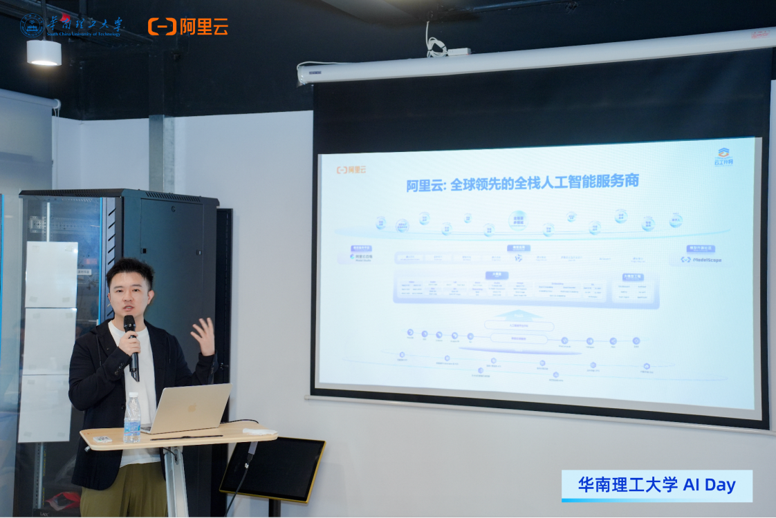 会议伊始,华南理工大学电子与信息学院副院长余翔宇致开场辞,介绍了本次AI DAY的活动背景和意义。随后,软件学院汤峰老师分享了其在产学协同课程建设中的实践经验,展示了如何将企业真实项目引入课堂教学,提升学生的工程实践能力和创新能力。阿里云高校合作专家崔远征则系统介绍了阿里云在支持高校AI人才培养方面的资源体系,包括课程共建、师资培训、平台支撑等内容,为教师开展AI教学提供了有力支持。此外,阿里云认证中心专家曹海坤详细解读了阿里云大模型认证体系,指出该认证不仅有助于学生掌握前沿技术能力,也为体系化的学习AI做了技能背书,受到现场教师广泛关注。